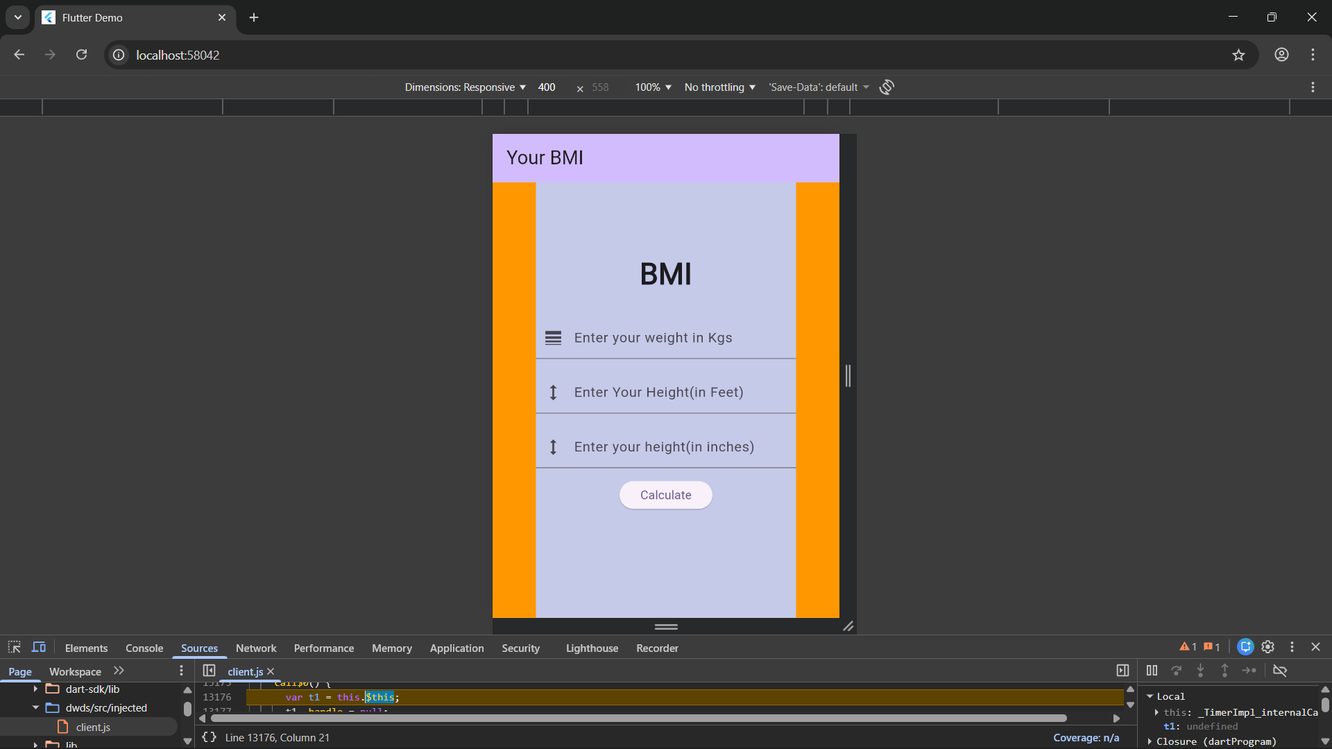 constproject={name:'BMI Mini app',tools: ['Flutter'],myRole:Android Developer,Description: I have created a simple flutter application in which you can see your body mass index by entering the relative information.,Demo:,};