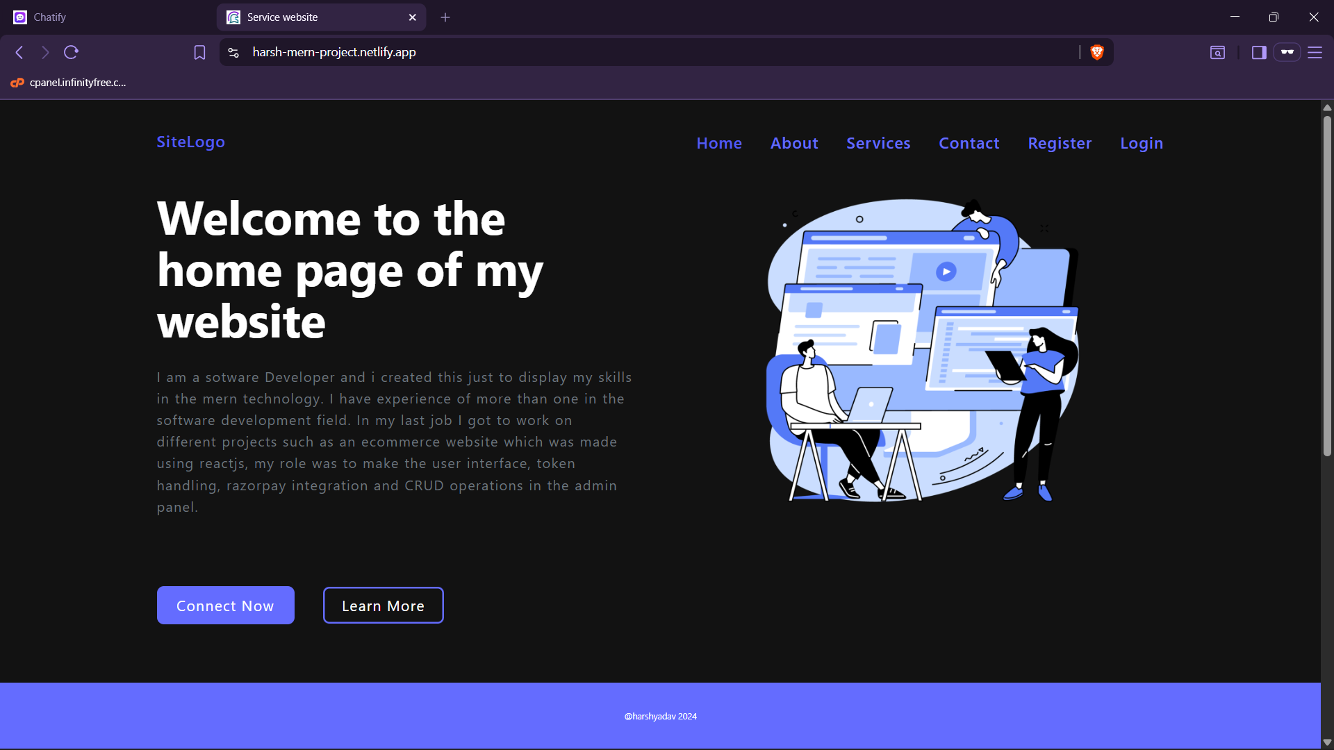 constproject={name:'Service App',tools: ['React', 'Node', 'Rapid API', 'MongoDb', 'Bootstrap'],myRole:Developer,Description: This MERN stack project showcases a dynamic website with CRUD operations and service displays. The React frontend, hosted on Netlify, utilizes Context API, useState, and useEffect for efficient state management. The Node.js backend, deployed on Render, implements controllers, routes, services, and token handling. MongoDB serves as the database, ensuring seamless data flow between frontend and backend components.,};