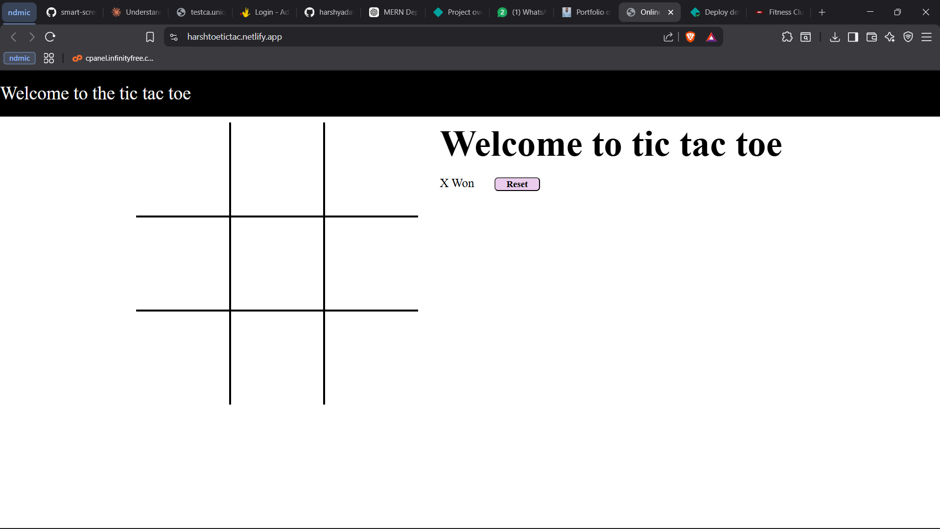 constproject={name:'TIC TAC TOE ',tools: ['HTML', 'CSS', 'JavaScript'],myRole:Developer,Description: Designed and developed a fully web-based Tic tac toe game using HTML, CSS and JavaScript to deepen my understanding of front-end web technologies. The game allows the user to complete the game in real time, with interactive features such as highlighting winning and preventing invalid moves. ,};